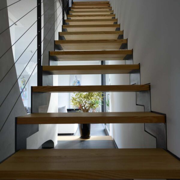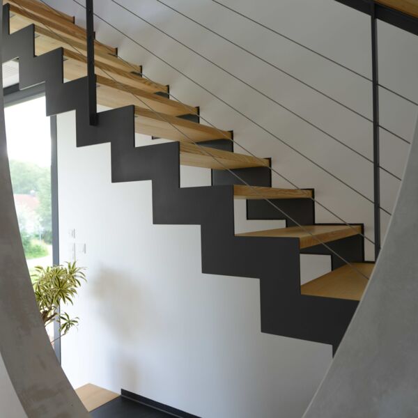 Das Einfamilienwohnhaus in Osterburken besteht aus 3 Baukörpern. Der Strassenraum wird mit einer Garage geschlossen. Ein Verbindungsbaukörper beinhaltet die Technik sowie den großzügigen verglasten Windfang mit Blick auf den Innenhof. Der schlichte, zweigeschossige Hauptbaukörper beinhaltet die Wohnräume und ist mir großzügigen Verglasungen lichtdurchflutet. Der Wohnraum mit versetzten Ebenen bildet einen großzügigen Zugang zum geschützten Innenhof sowie zur Terrasse und freien Landschaft gen Süden.