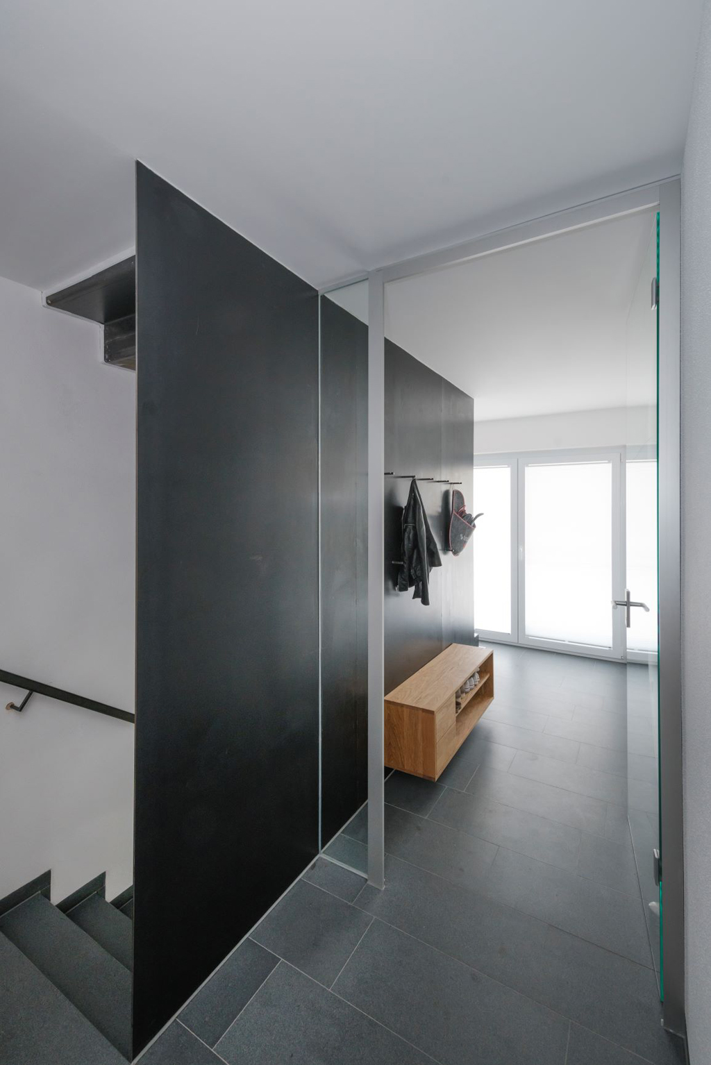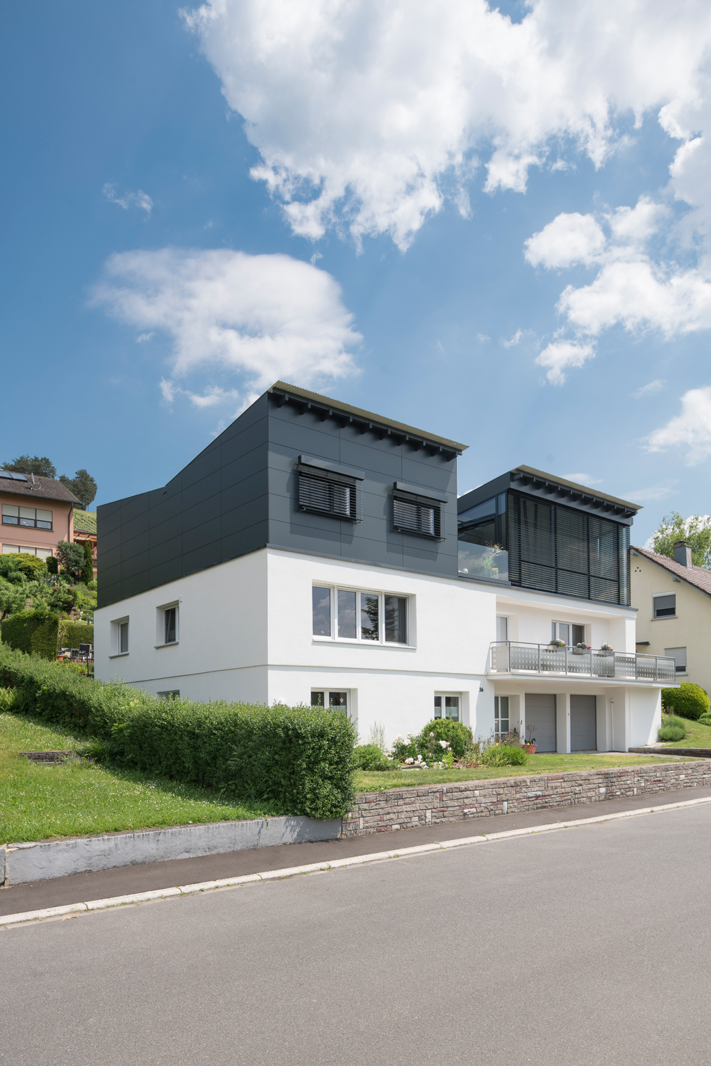 Ein junges Paar entschließt sich, statt einem Neubau in das Wohnhaus der Mutter der Bauherrin zu ziehen und dies umzubauen. Bestand: Ein, zweigeschossiges Gebäude mit einem teilausgebauten Dachgeschoss mit Satteldach. Der Entwurf sieht vor, das komplette Dach abzunehmen und ein Geschoss aufzusetzen. Um dies in die umgebende Bebauung einzugliedern und die Firsthöhe zu verringern wird statt einem Sattel- ein Schmetterlingsdach aufgesetzt. Dies ermöglicht eine grossflächige Verglasung und Öffnung des Wohnraumes gen Süden. Eine eingeschobene Loggia bietet einen Wind- sowie teilweise regengeschützten Freisitz. Über eine Spindeltreppe gelangt man zur Terrasse im Garten.